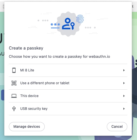 Passkeys is the common term used to describe the Fido2 standard called “WebAuthn”. It is a web authentication standard supported by most modern browsers, phones and devices, which leverages your devices key-management features (like touch ID on a mac, a phone authenticator, a yubikey, some password managers support creating and storing passkeys, etc). Those passkeys can then be used by the user to sign payloads when needed. Here’s some screenshots with some examples of WebAuthn prompts shown in your browser during Credential creation, or during Signing using those Credentials.