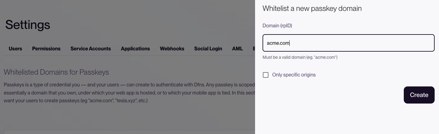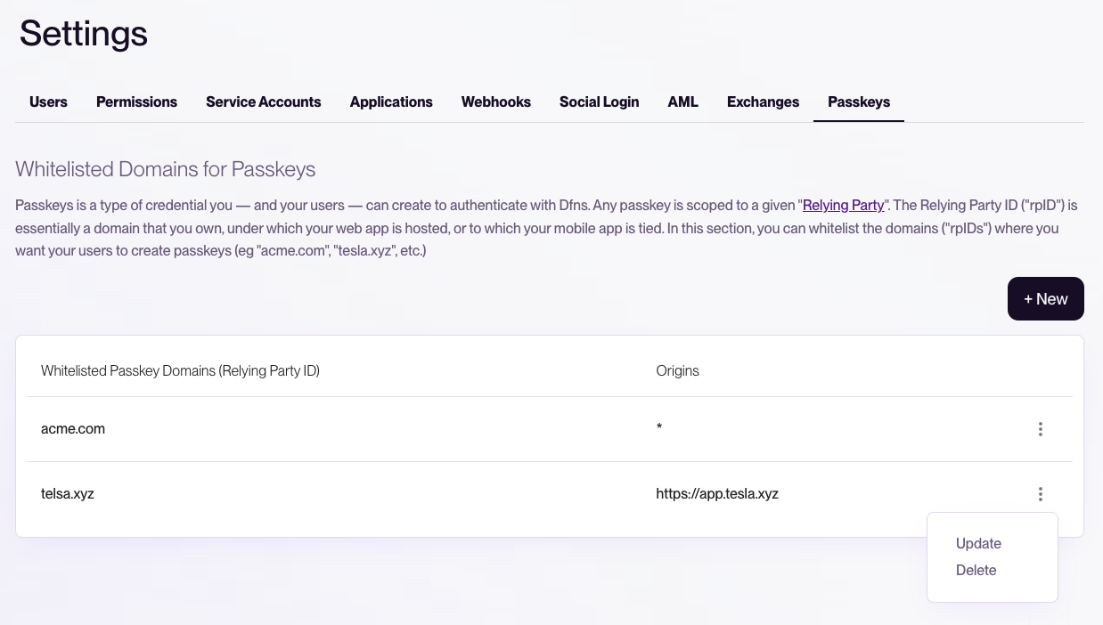 ) where your users need to create/user passkeys, you can now go to Dfns dashboard, into Settings > Passkeys
