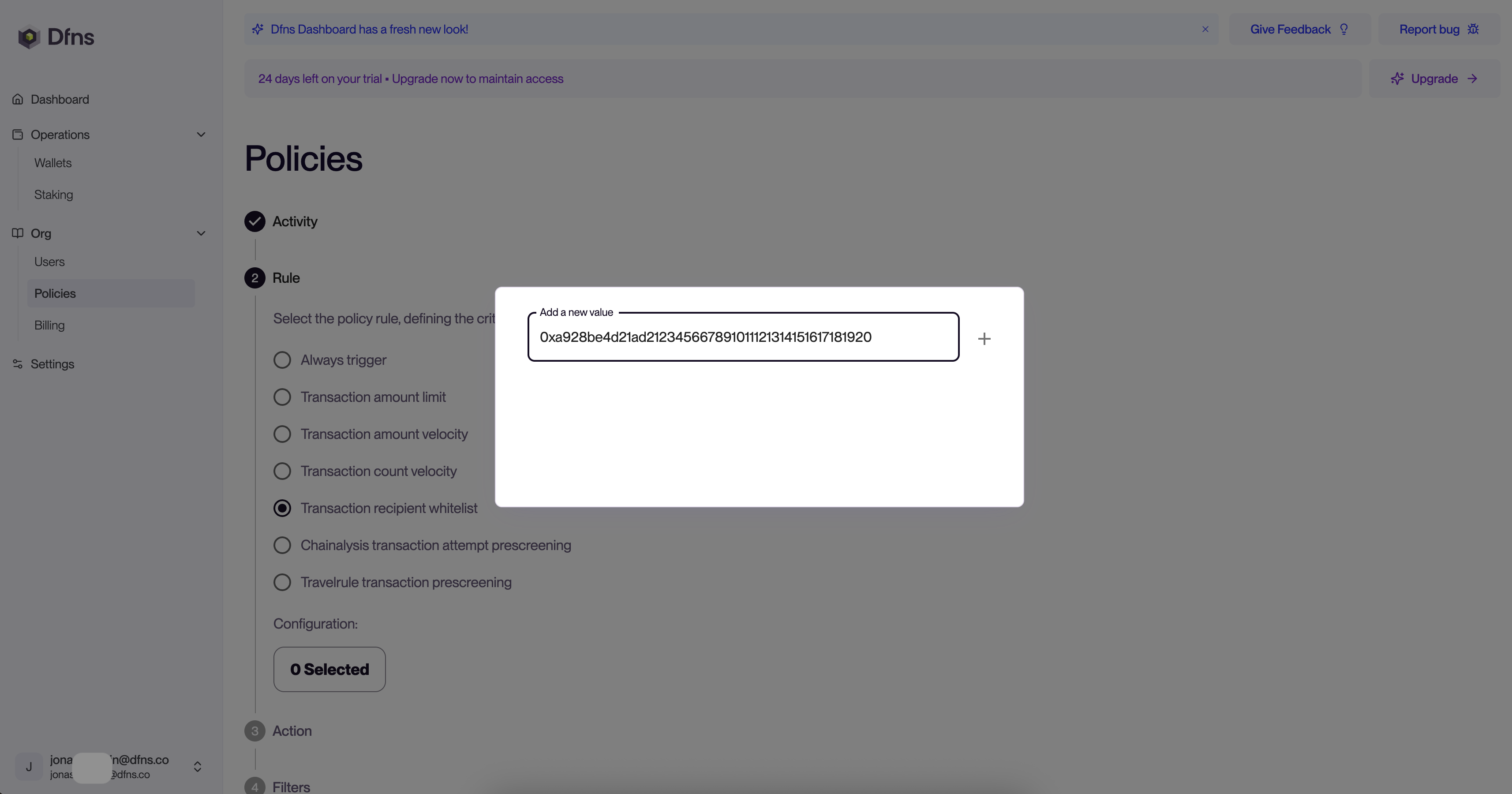 In which case should the policy trigger? For our example, select “Transaction recipient whitelist”, then click Configuration and paste the whitelisted destination wallet address. All transactions to this wallet address will go through, while all others will trigger the policy.