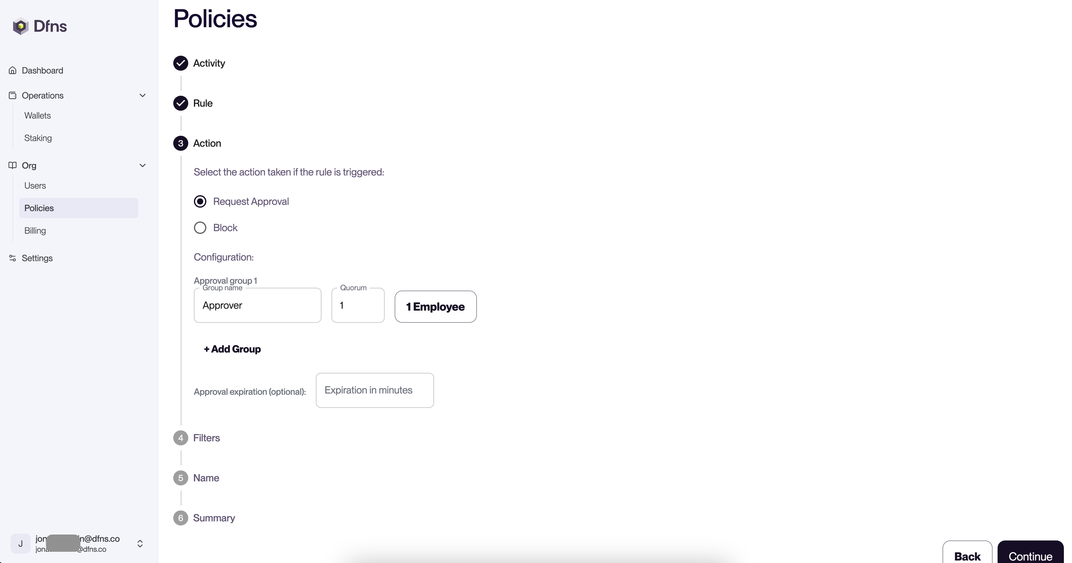 (direct link: https://app.dfns.io/v3/org/policies) and click ➕ New Policy.