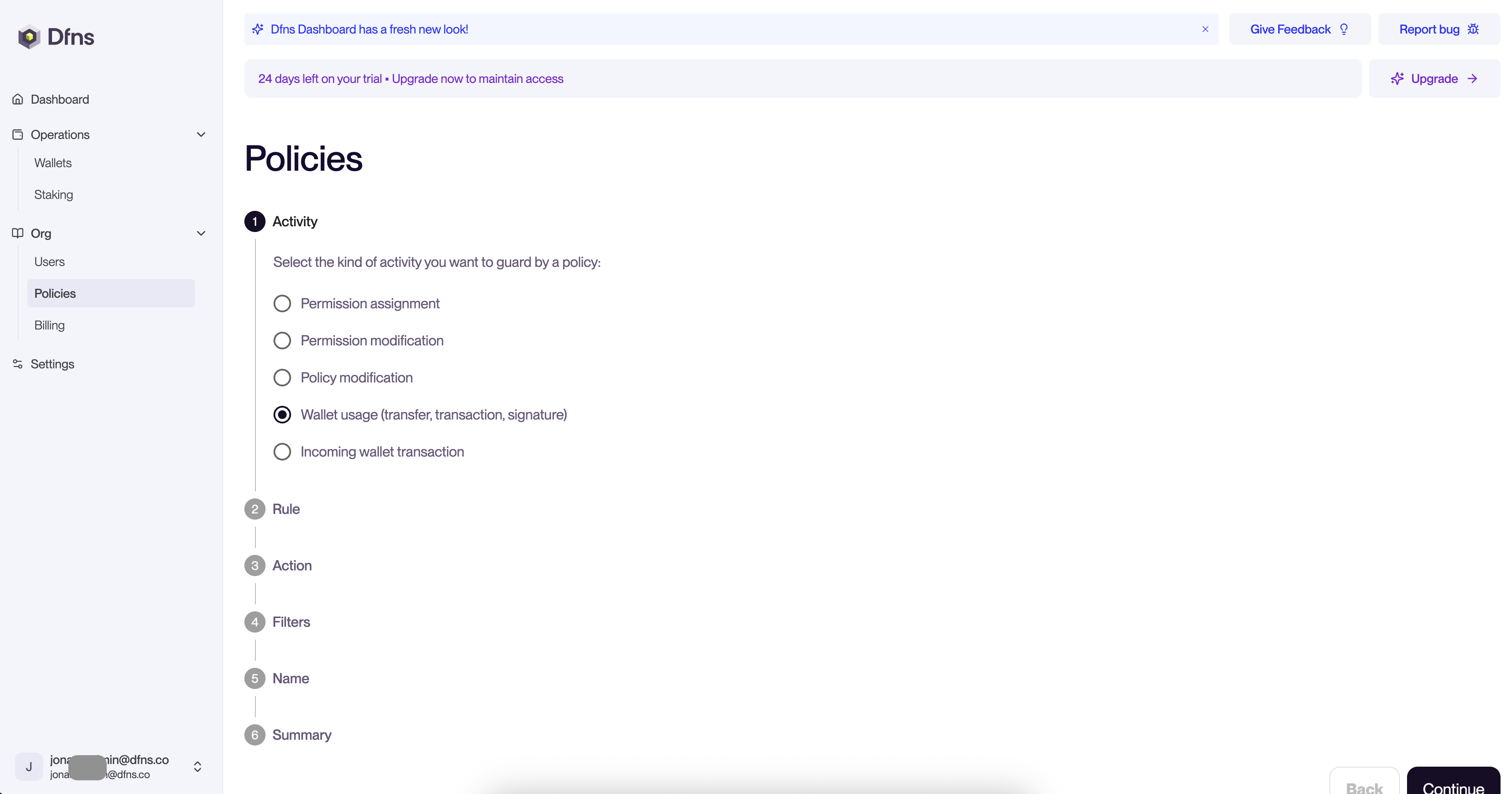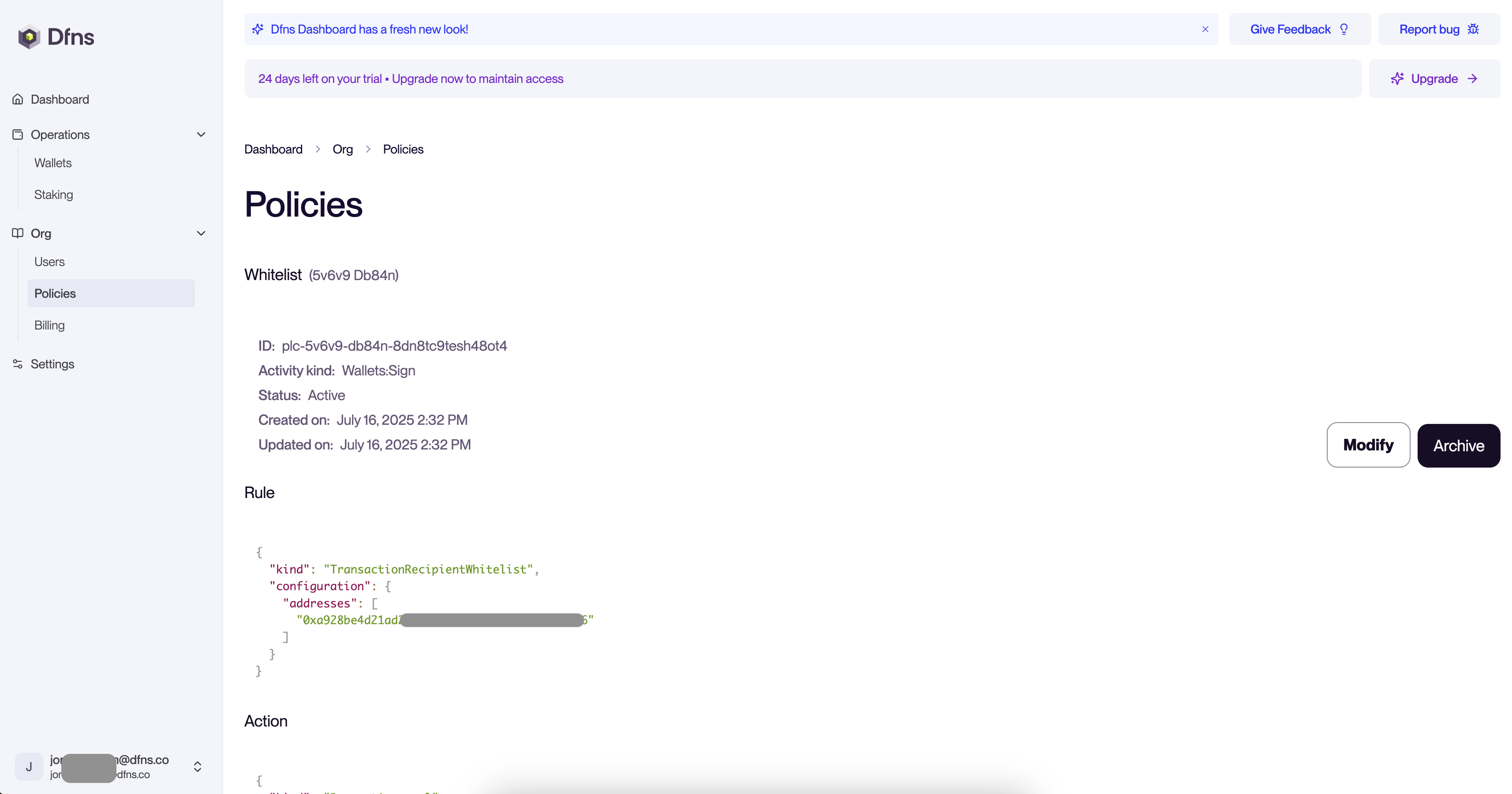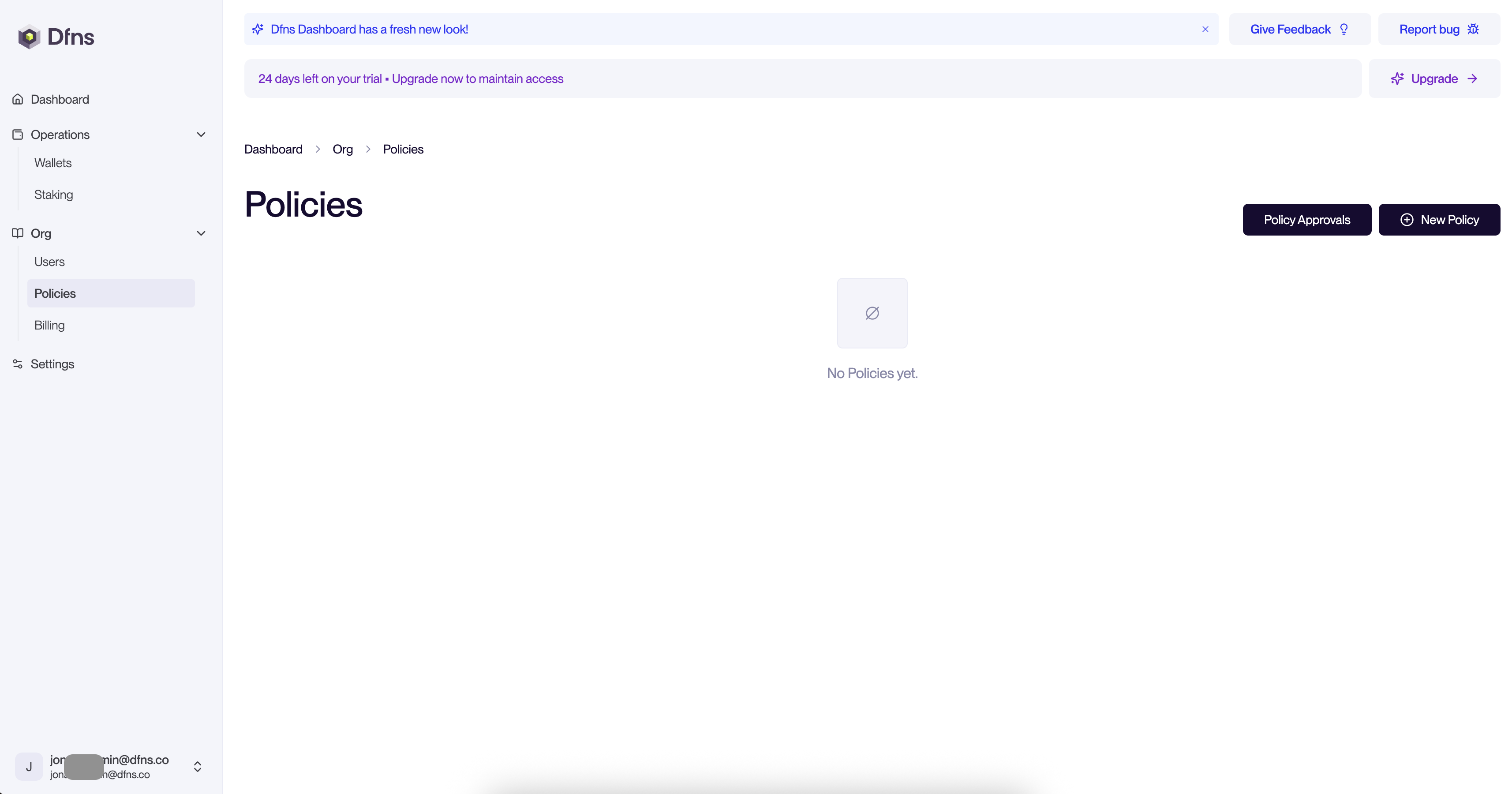 This feature is available starting from our Basic plan. For more details see our pricing page.Policies are a programmable set of safeguards behind all actions on the Dfns infrastructure. You can configure them to validate actions taken in your organization. For more details, please read the dedicated section: policy-engine