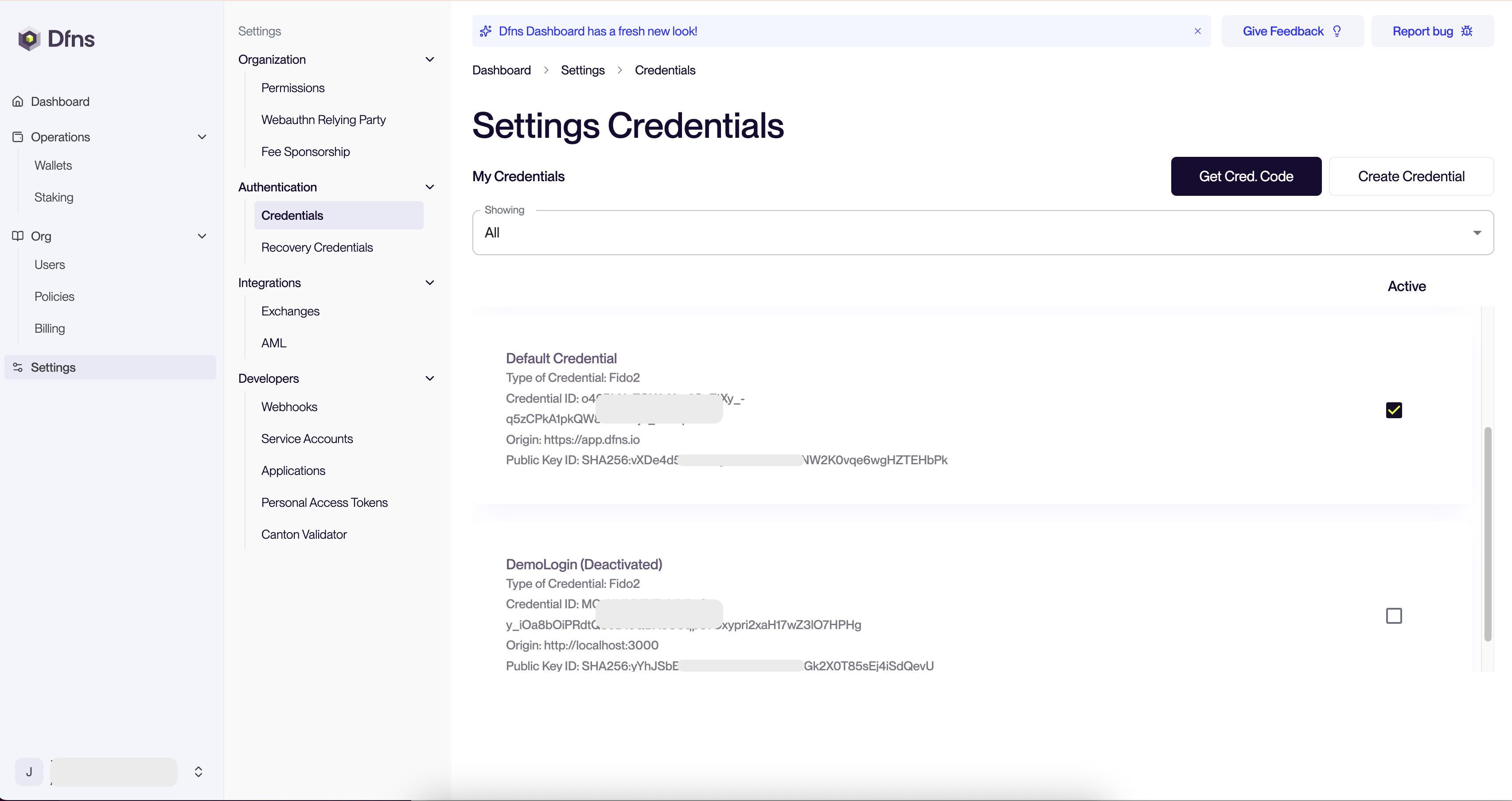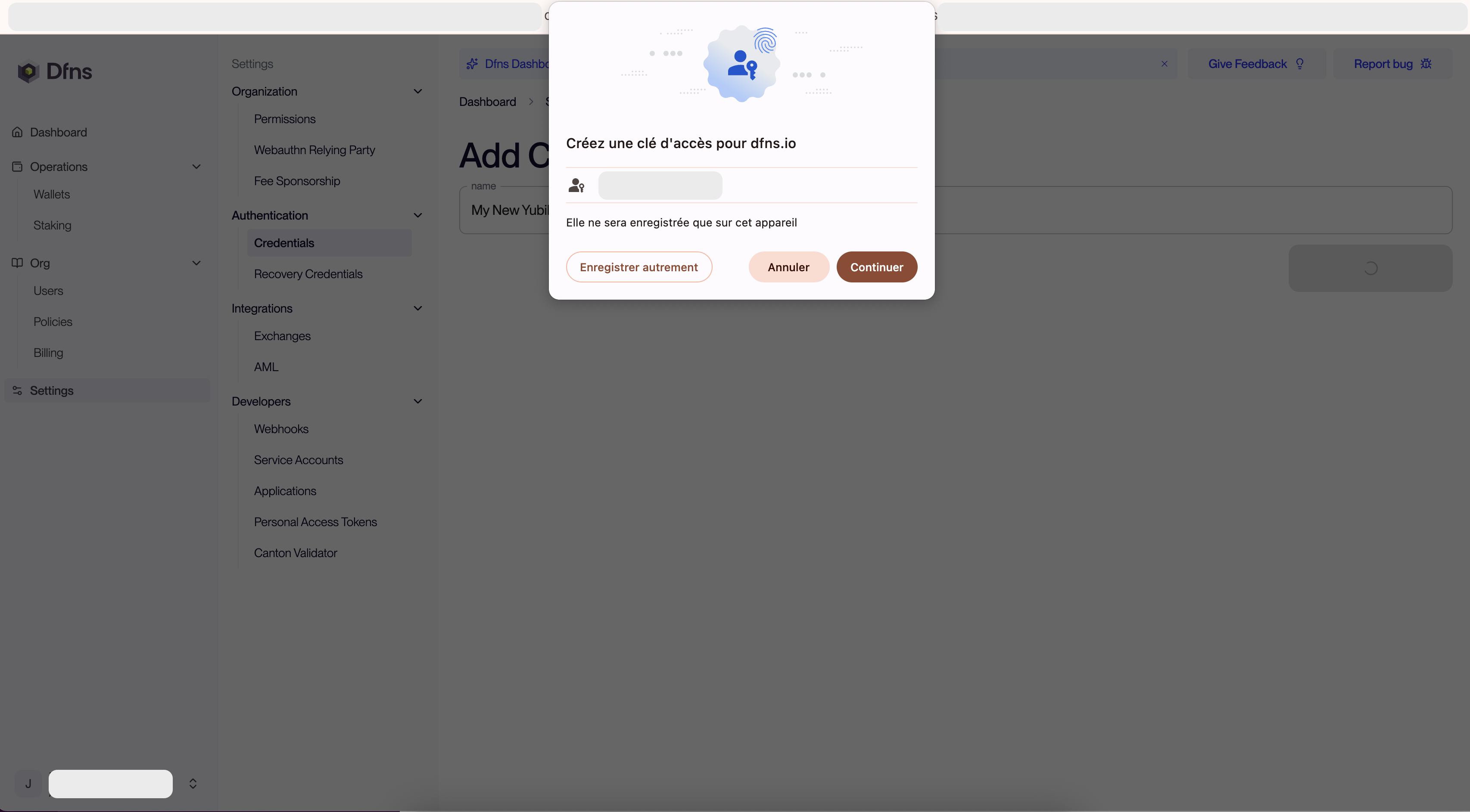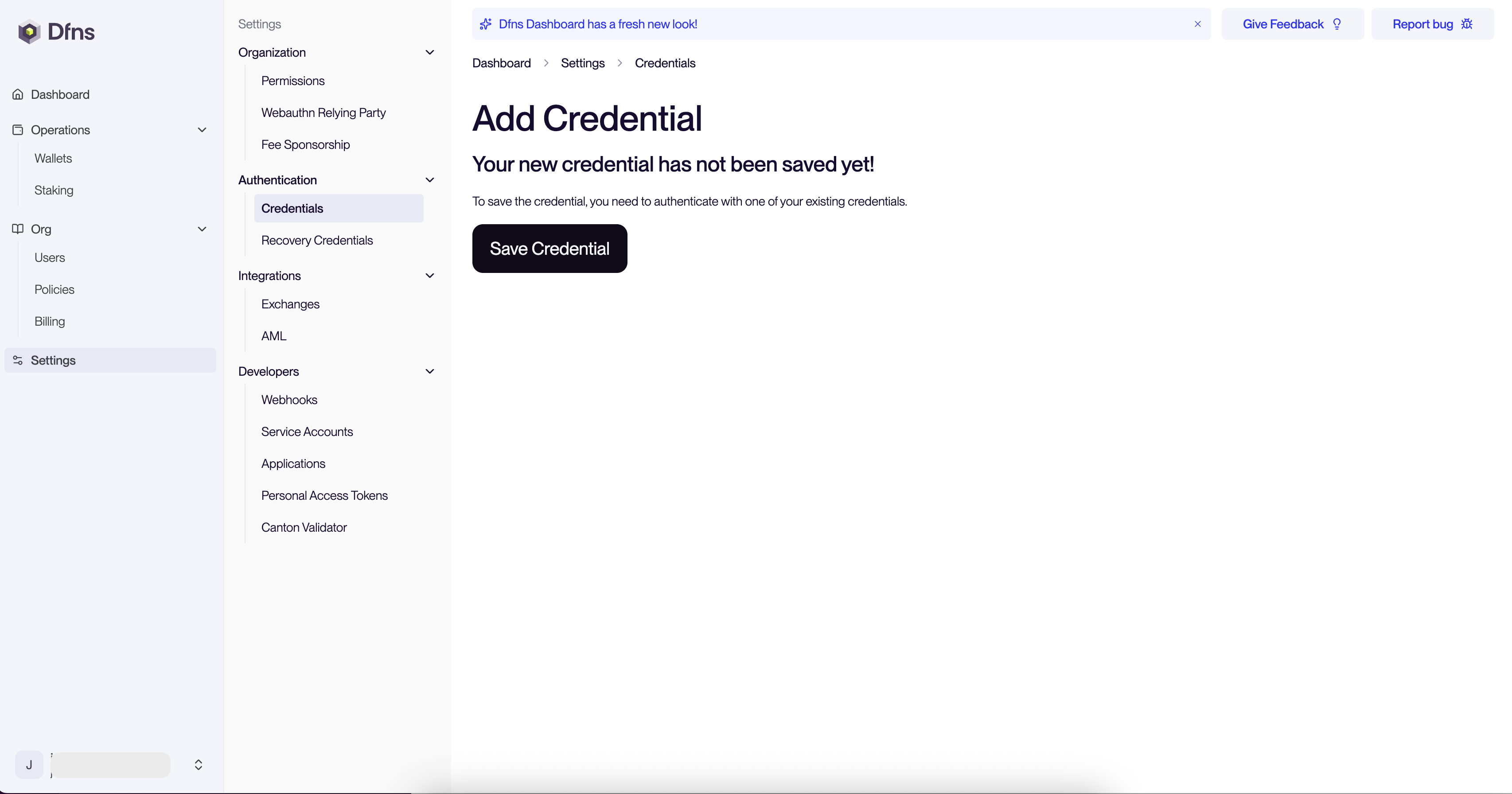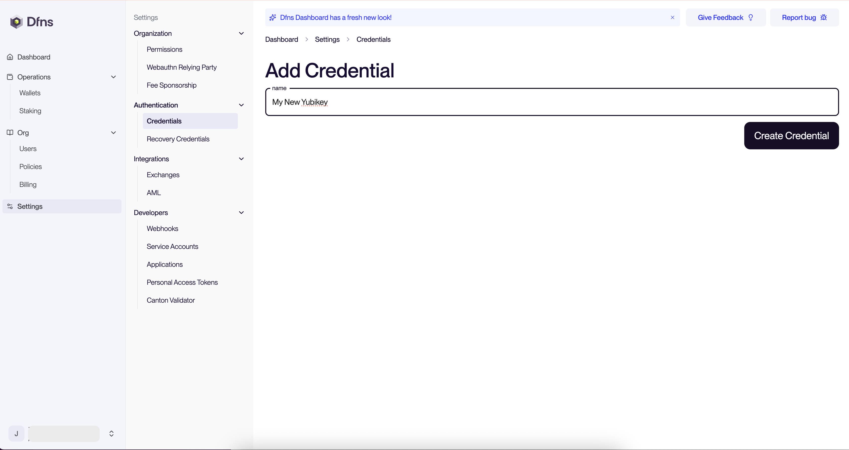 - “Create Credential” button is not visible: This may be a permissions issue. Please contact your Dfns organization administrator to ensure your role has the necessary permissions.