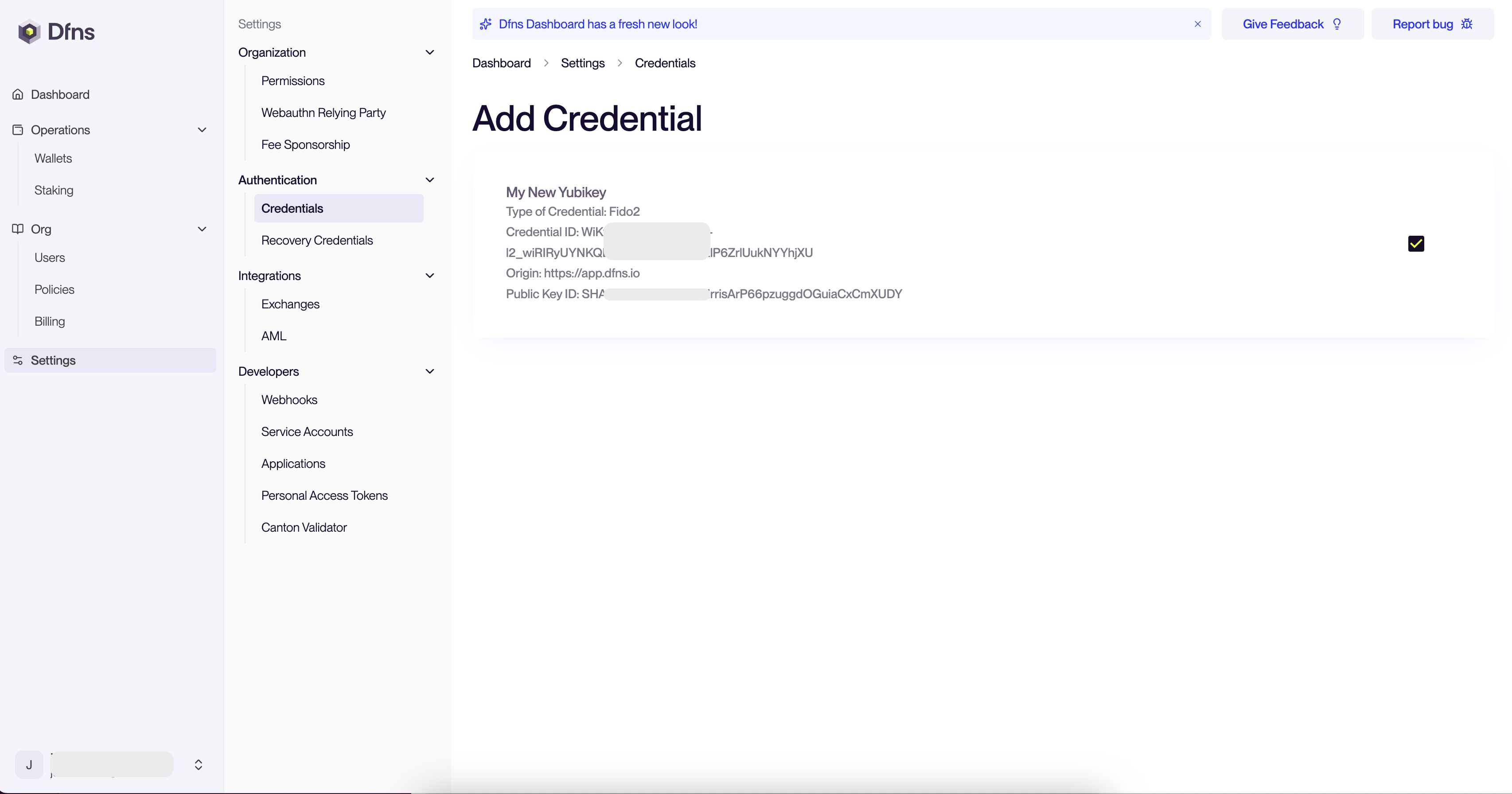 Congratulations! Your new passkey has been successfully added to your Dfns account. It will now appear in your list of registered passkeys under the Credentials tab. You can now use this passkey to log in to Dfns and approve policy-controlled actions.