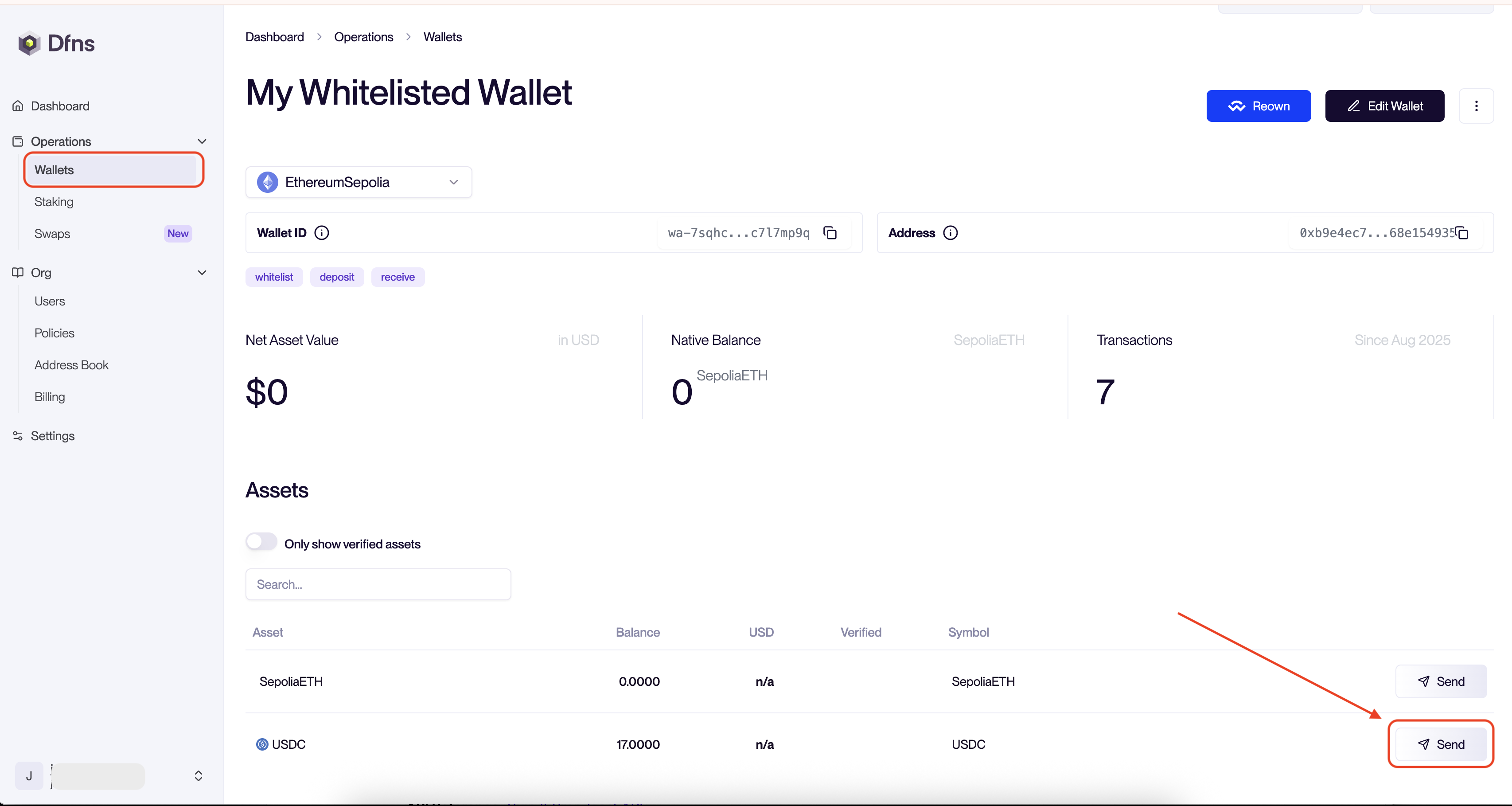 From the main menu on the left, click on the Wallets tab. This will display a list of all the wallets in your organization.Find and click on the wallet you want to send the asset from. This will take you to the wallet’s detail page, showing its balances and transaction history.