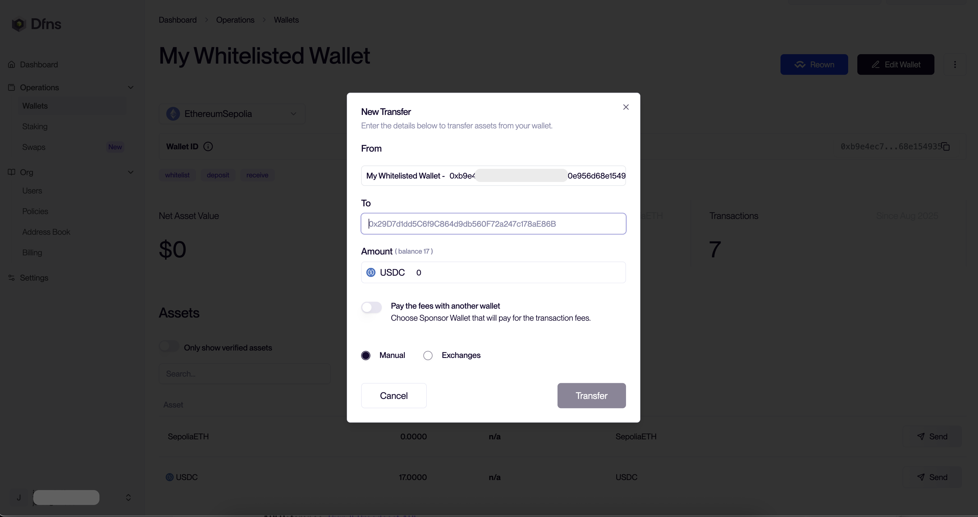 - Pay the fees with another wallet: You can chose to use our Fee Sponsor feature for that transfer. In such case, select the sponsor.