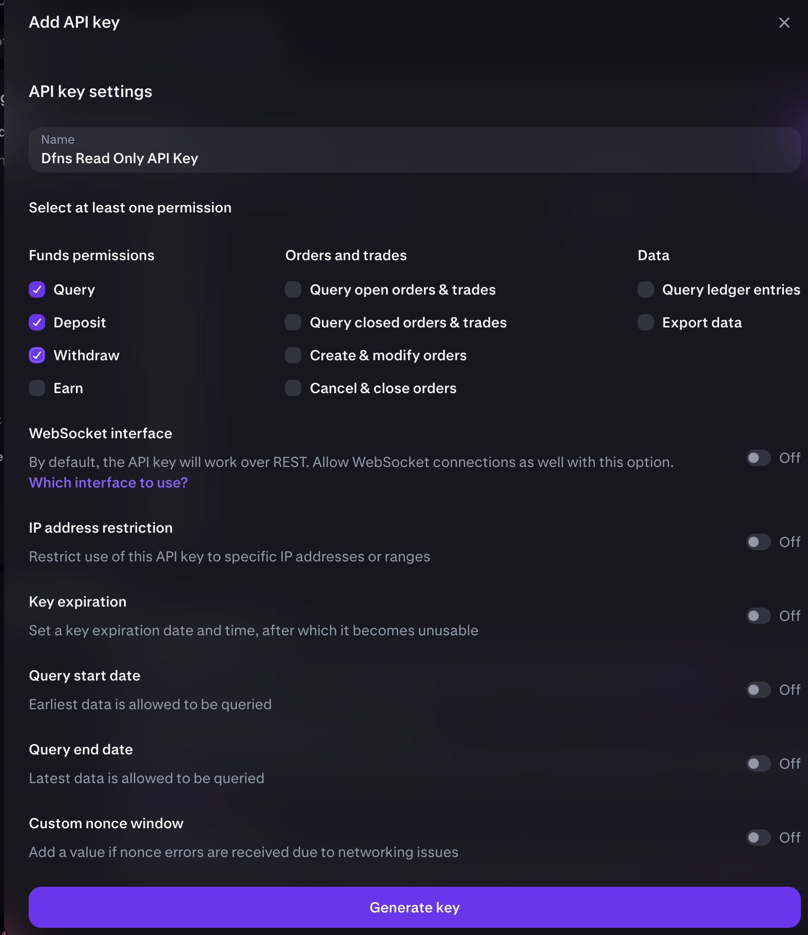 . Log into your Dfns dashboard and click Settings=>Exchanges=>New. Copy the Public and Private API keys from Kraken into the corresponding fields. Go back to Kraken and generate a second Write API key with the following minimum permissions: