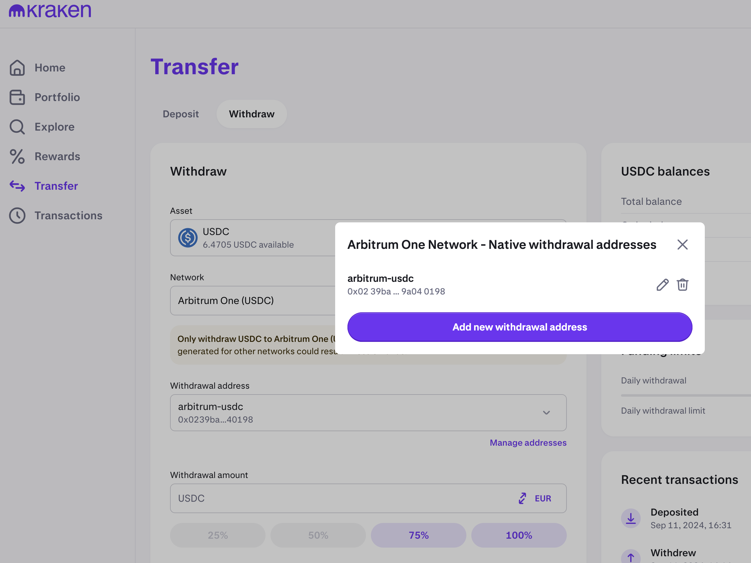 Kraken enforces a whitelist policy for all withdrawal wallet addresses. This means that before withdrawing any assets to an external wallet, the wallet address must be added to a whitelist in your Kraken account. Follow these steps to whitelist a wallet address using Kraken’s standard interface:- Log into your Kraken account. Go to the main Kraken app (not Pro).
