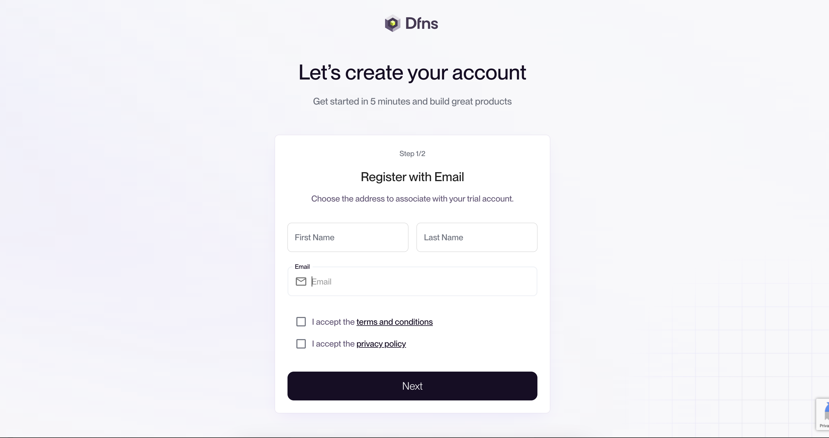 Navigate to app.dfns.io/get-started to create a new organization with you as the first Employee, you will be registered as the first admin.