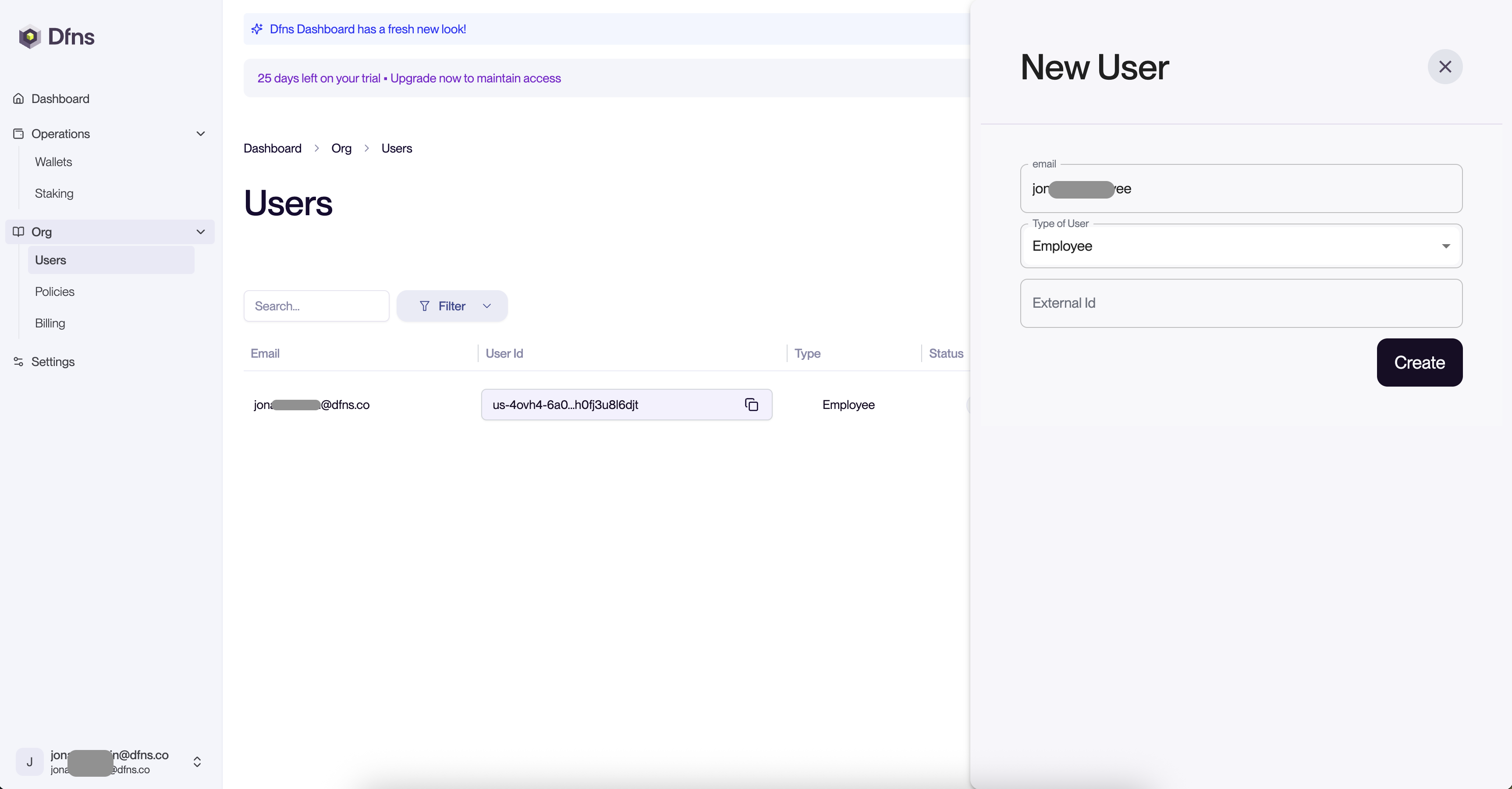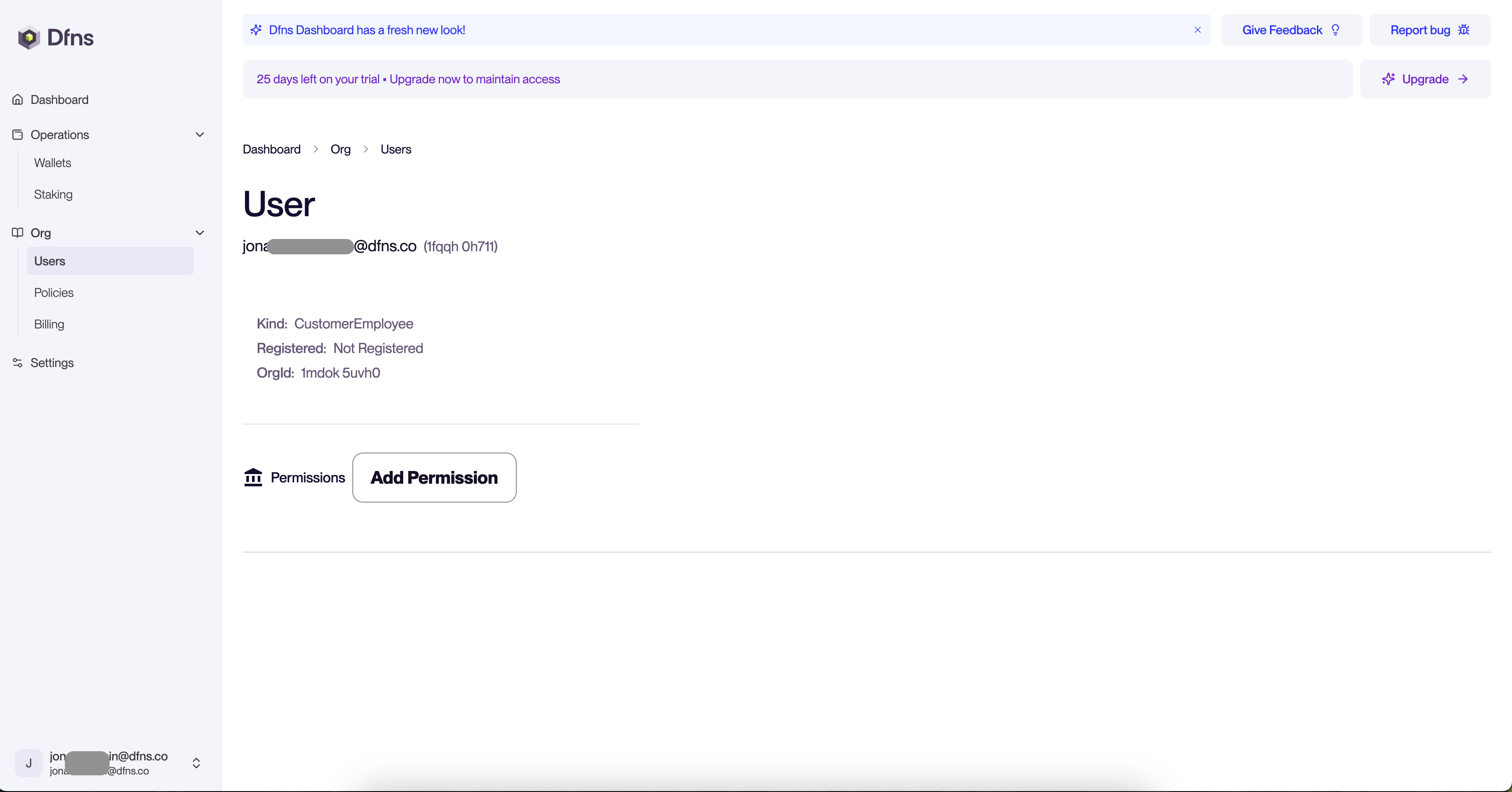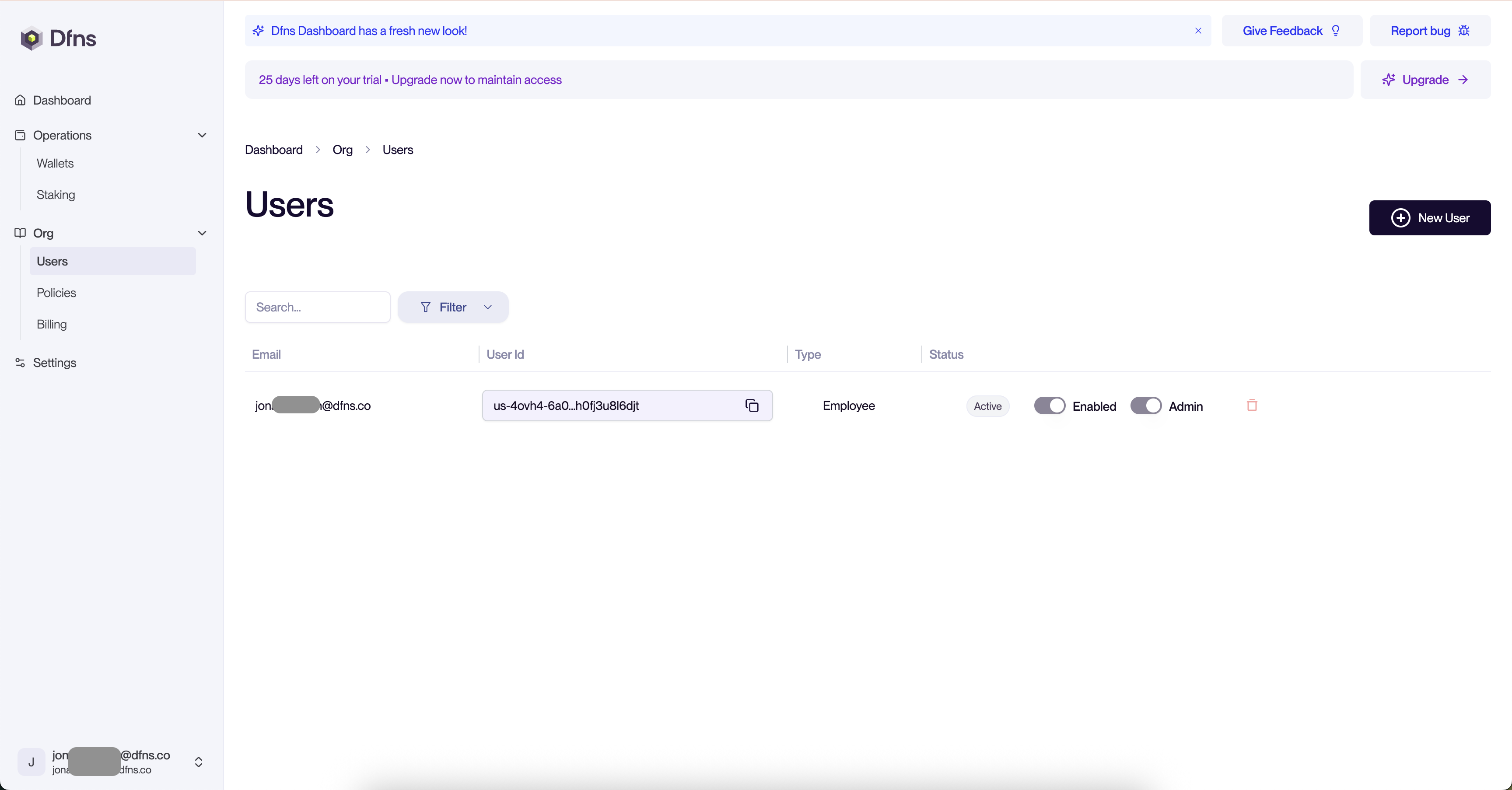 (direct link: https://app.dfns.io/v3/org/users).Notice that you are on your own right now, and you are an Admin 🎉The new users will be allowed to connect to the dashboard and use the API following the permissions you will grant them (they will have no permission when you will create them).
