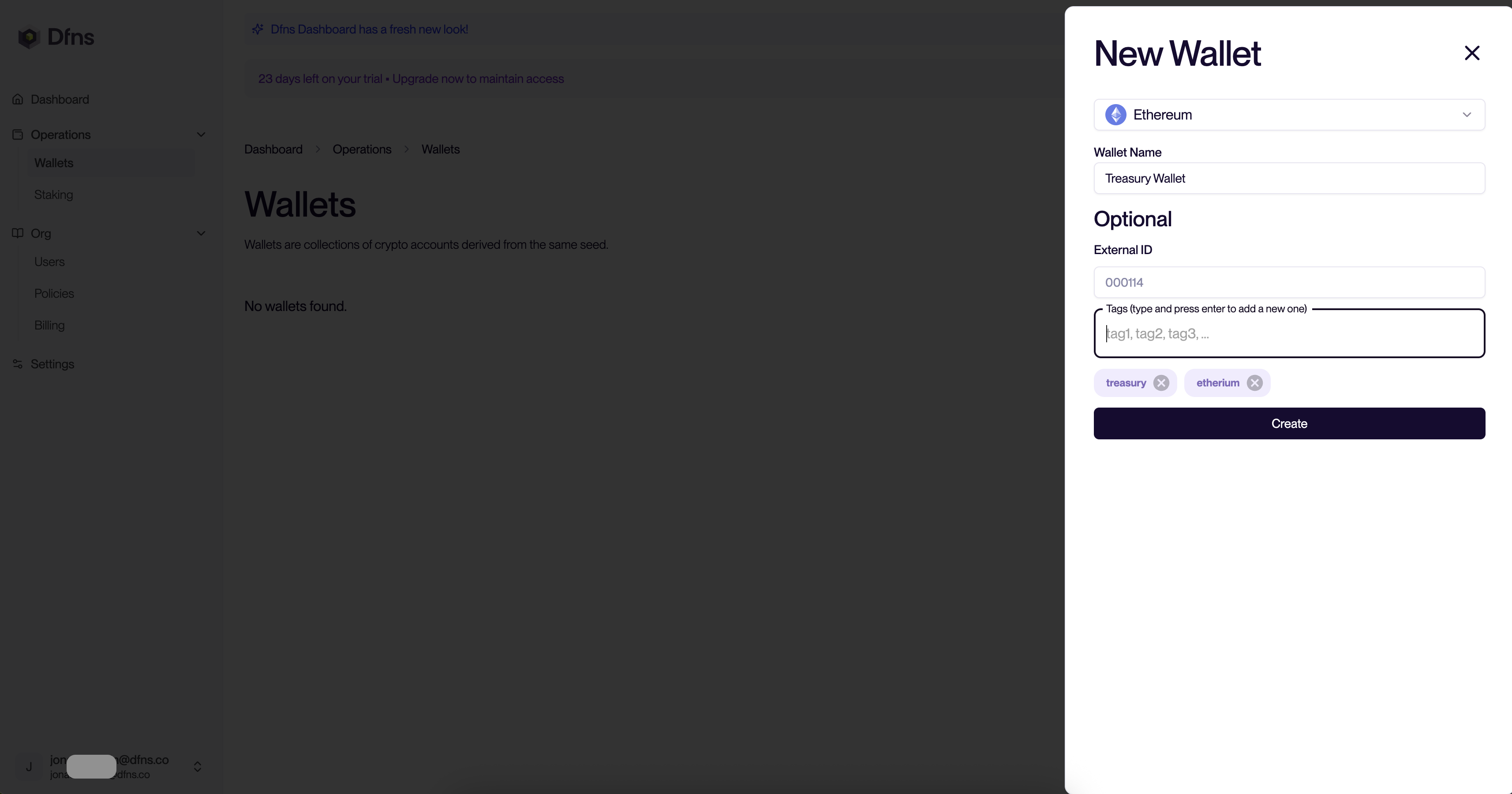 (direct link: https://app.dfns.io/v3/operations/wallets), and click ”➕ Create a Wallet”. In the panel you can select the network out of the list of all supported ones. Give your wallet a name, and optionally add tags for easier recognition (for instance policies can target specific tags). Hit “Create” and 🔑 sign the action with your passkey.