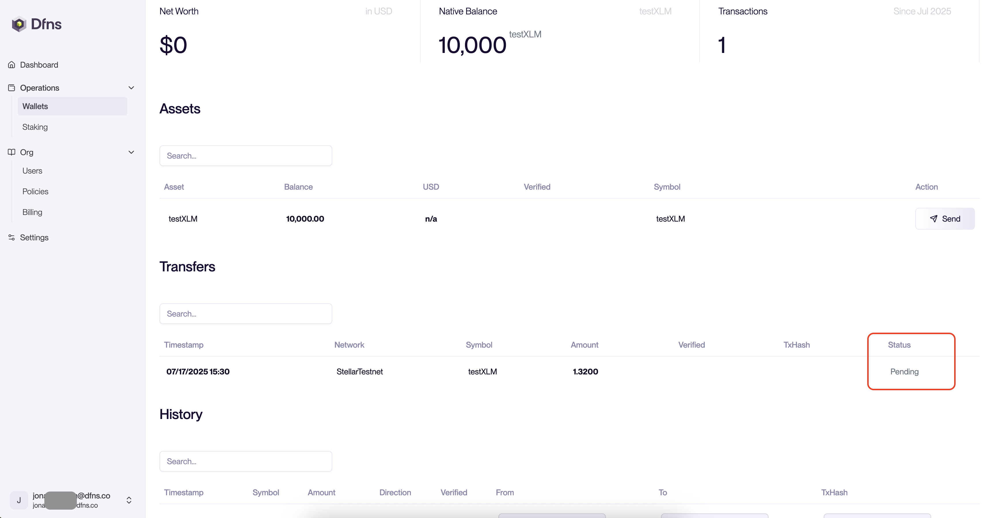 Once you have received some assets, scroll down to the relevant one and click “Send” to use Dfns transfer function. You just need to provide the destination wallet address and the amount you wish to send. Hit “Transfer” and 🔑 sign the action with your passkey.