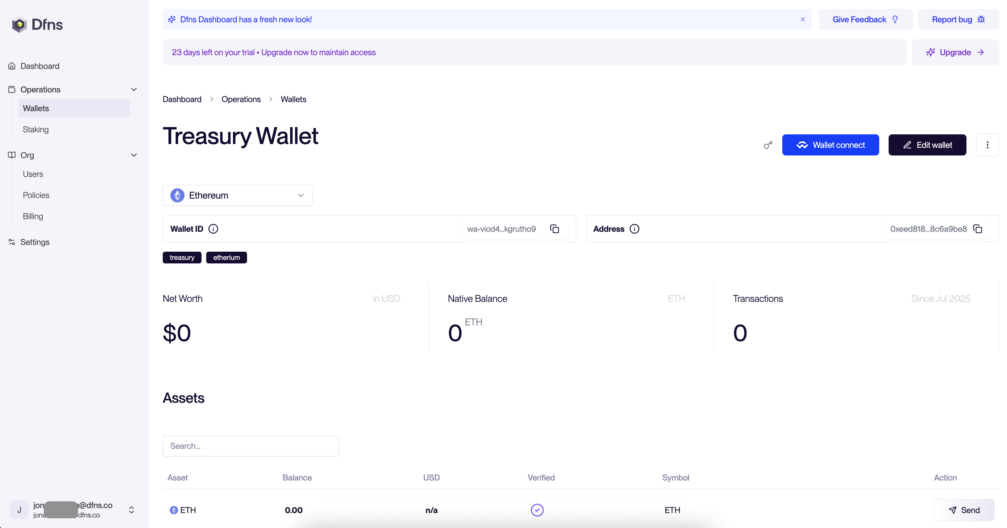 A private key is created for you and secured in the Dfns key infrastructure. Your wallet can be used for transactions, using its address displayed on the detailed page. Dfns also starts monitoring transactions on the blockchain to index and display them on the wallet page along with the final balances.
